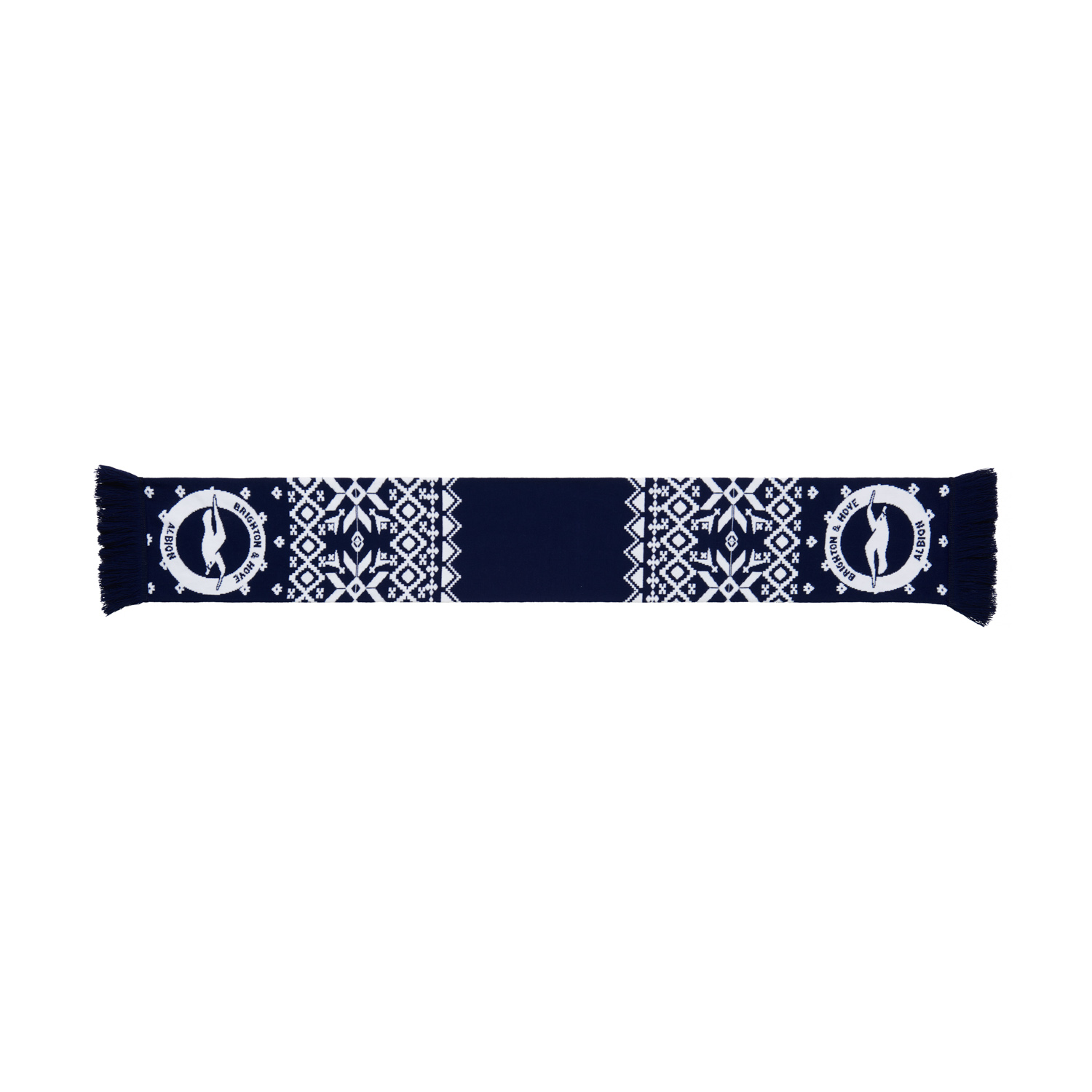 Wrap up warm and festive with the BHAFC Patterned Christmas Scarf. Featuring a navy base with intricate white seasonal patterns and a Brighton & Hove Albion crest at each end, this knitted scarf combines comfort with festive style. Finished with classic fringed edges, it’s the perfect accessory for match days or winter celebrations.