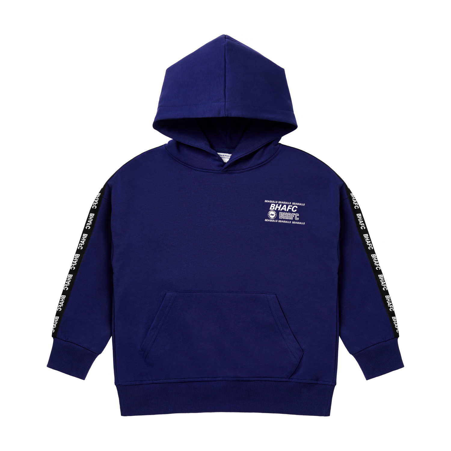 The BHAFC Junior Wox Hoodie is a dark blue layer designed for young Albion fans. Featuring a kangaroo pocket and a roomy hood for everyday comfort, it’s detailed with club-inspired graphics on the chest and branded sleeve taping that runs from shoulder to cuff. This hoodie is a standout piece for matchdays and beyond.