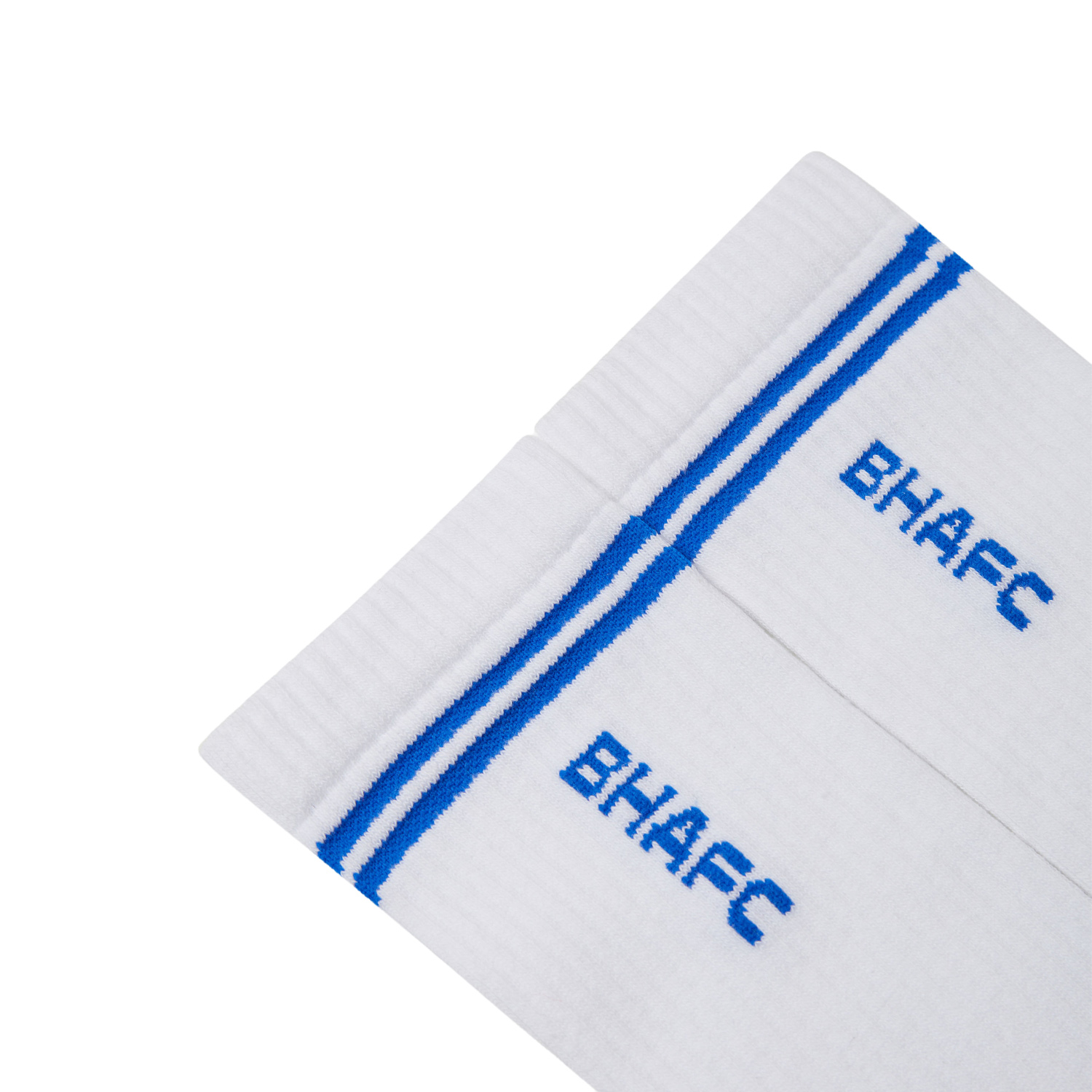 Celebrate Albion Heritage with the ART OF Brighton Woven Socks. These white cotton blend ribbed socks feature blue stripes and BHAFC lettering.