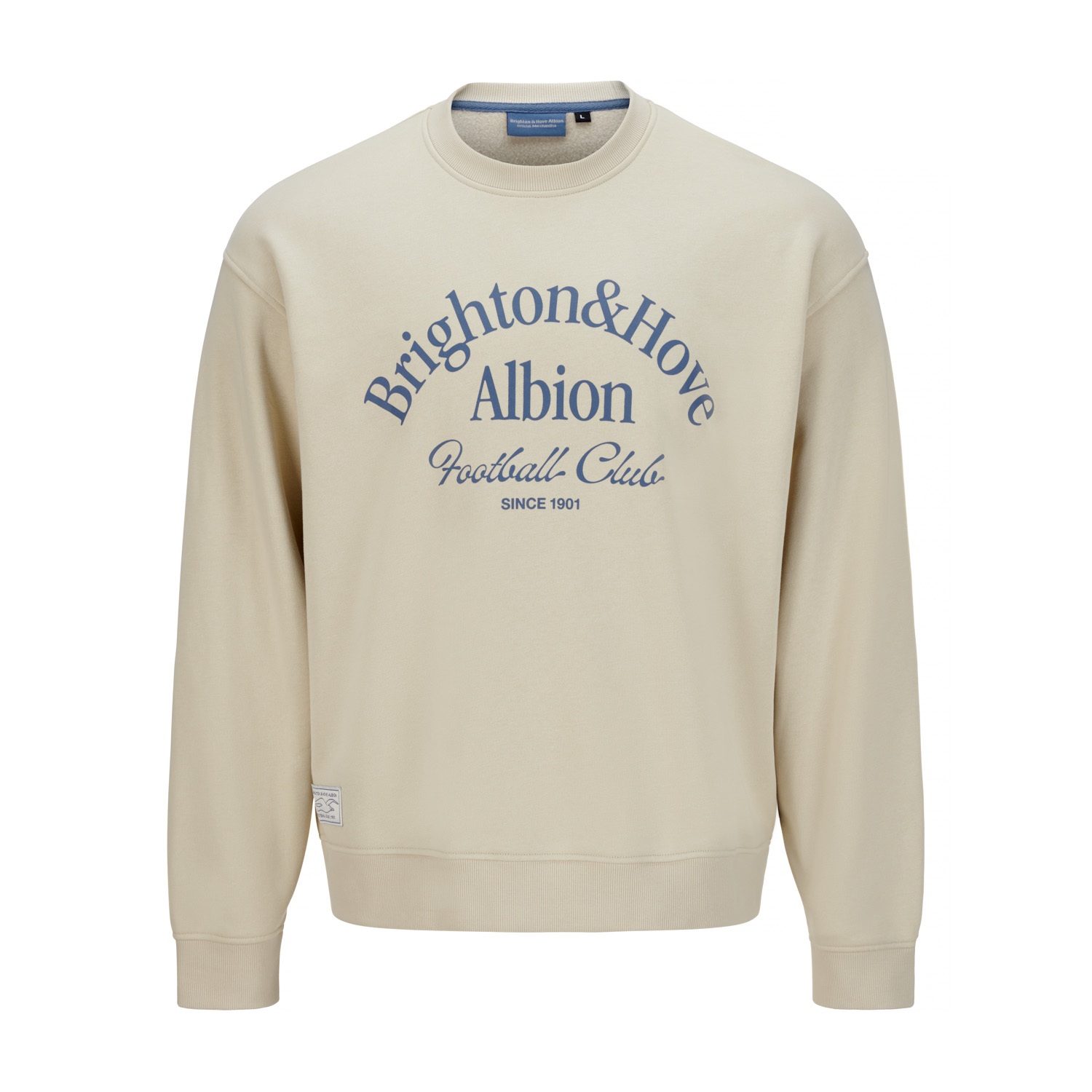 The BHAFC Sand Relaxed Sweatshirt blends comfort and heritage with a soft beige base and ribbed detailing at the collar, cuffs, and hem. A light royal blue chest graphic and a subtle Albion inspired woven label adds a nod to the club’s roots, making it a versatile staple for cooler days.
